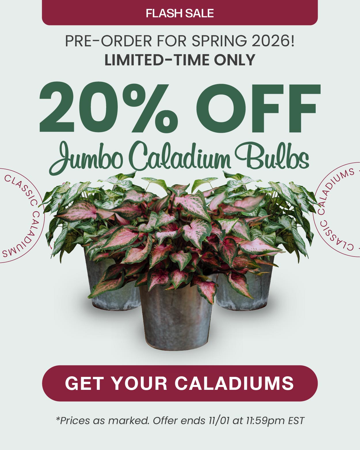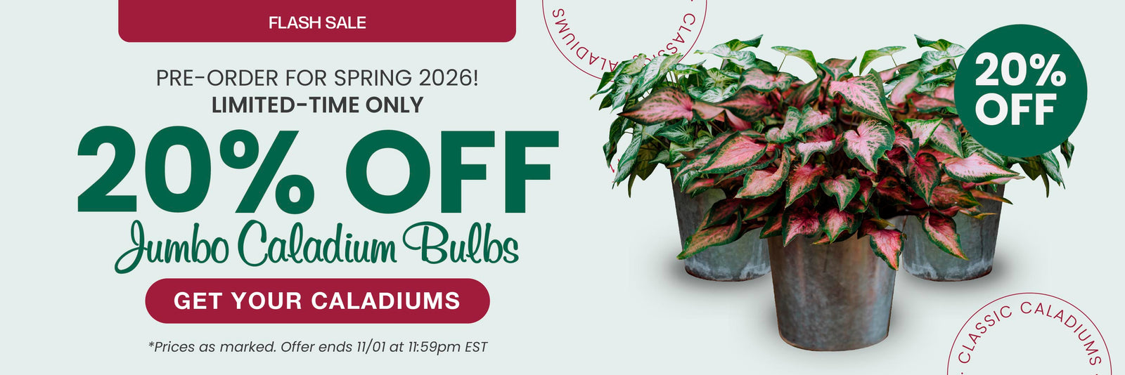 Whether you're looking to enhance your garden or create a striking indoor display, Proven Winners Heart to Heart Caladiums, such as ‘Chinook,’ ‘Fast Flash,’ and ‘Radiance,’ bring a unique charm to any space. With varieties suited for both sun and shade, you'll find the perfect caladium for your environment. Be sure to explore each plant’s care instructions, and choose from our selection of bulbs available for pre-order now.