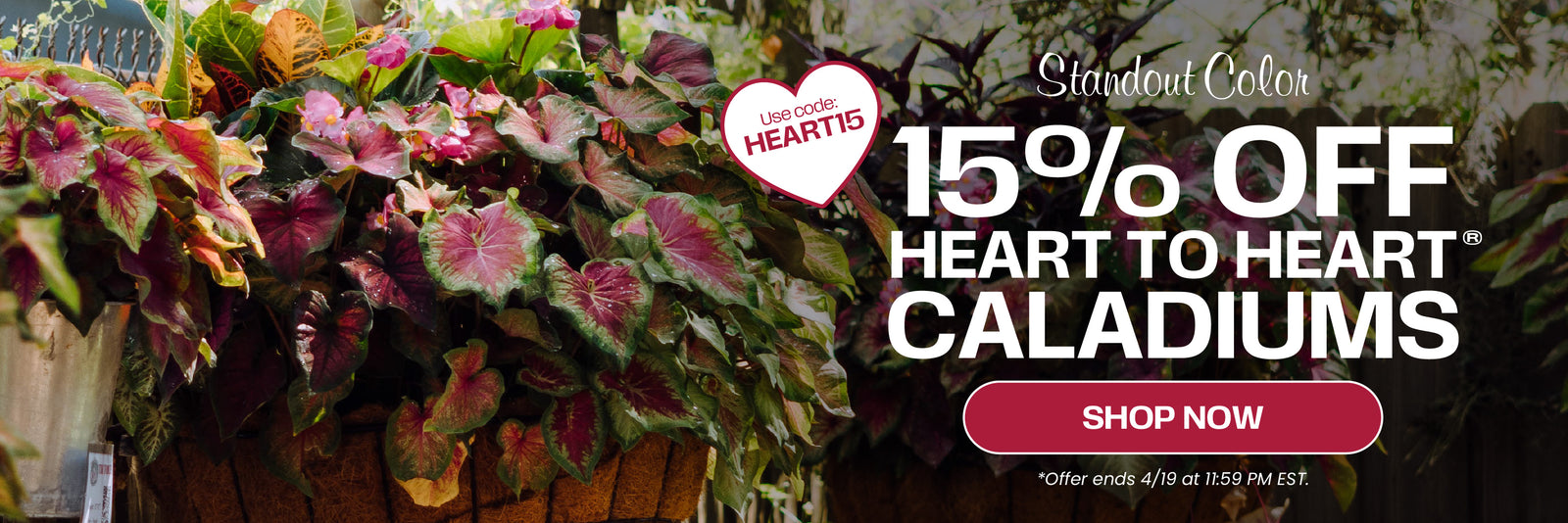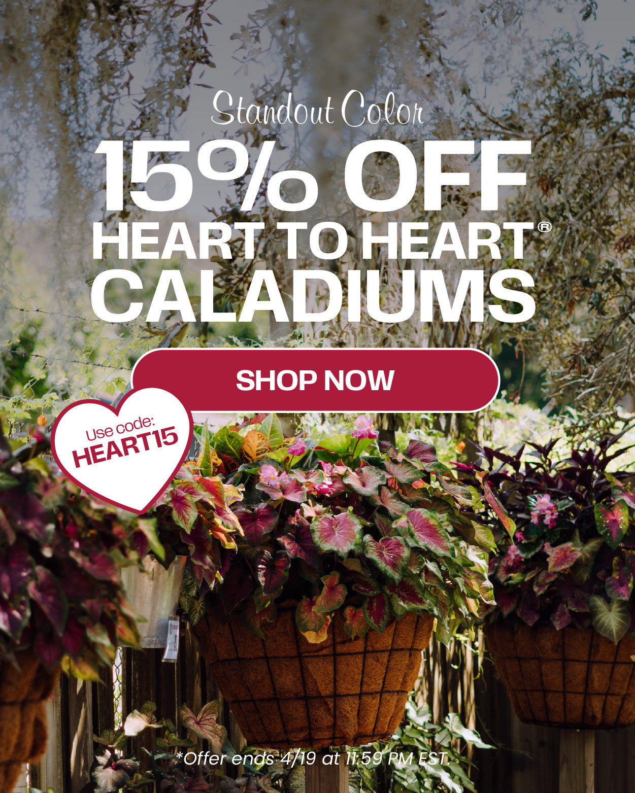 Whether you're looking to enhance your garden or create a striking indoor display, Proven Winners Heart to Heart Caladiums, such as ‘Chinook,’ ‘Fast Flash,’ and ‘Radiance,’ bring a unique charm to any space. With varieties suited for both sun and shade, you'll find the perfect caladium for your environment. Be sure to explore each plant’s care instructions, and choose from our selection of bulbs available for pre-order now.